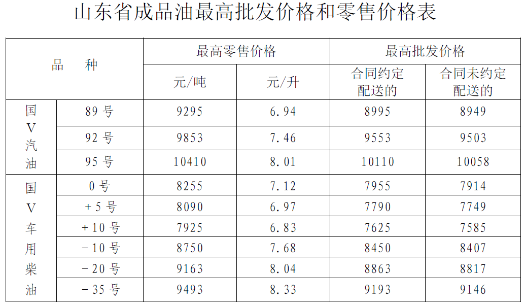 备注: 1.成品油生产经营企业供国家储备用汽、柴油(国Ⅴ标准品)价格分别为每吨8535 和7495 元。供渔业、林业、农垦用汽、柴油供应价格暂按供国家储备用油价格执行。 2.国Ⅴ标准普通柴油最高批发、零售价格按同标号车用柴油价格执行。 3.车用乙醇汽油最高零售价格按照同标号汽油最高零售价格执行。 4.表中价格包含消费税、增值税以及城建税和教育费附加。 5.部分城市销售的国Ⅵ标准的车用汽柴油价格暂按国V 标准车用汽柴油价格执行,待国家批复新的价格后再作调整。 6.其他相关价格政策按国家发展改革委《石油价格管理办法》和我省现行价格政策规定执行。 |